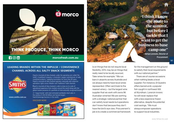 161 is on things that do not require local flexibility ; 20 % may be on things that really need to be locally sourced . Take wines for example : “ We run bars in airports across Australia and we always need to have local wines represented . Often we ’ d look to the nearest winery – but the largest wine supplier that we work with owns 96 Australian wineries ! We are working with a strategic national partner that can satisfy local needs but operations don ’ t know that because they don ’ t have the bird ’ s eye view . Procurement ’ s job is to create a commercial framework for the management on the ground to satisfy their local requirements with our national partner .”