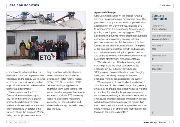The experience of the ETG Commodities team also plays a key role in the company ’ s growth and continued strengths . “ Our traders and merchandisers are well experienced and understand the various risks of the business . When hiring new employees we ensure they have the market intelligence and connections which we can leverage on ” notes Anshul Nagar , CFO at ETG Commodities . “ ETG believes in mitigating the risks and thrive to innovate tools for the same , from hedging mechanisms to insurance products ETG has every tool at its disposal to make sure interest of our share holders and stake holders are protected at every step we take .”