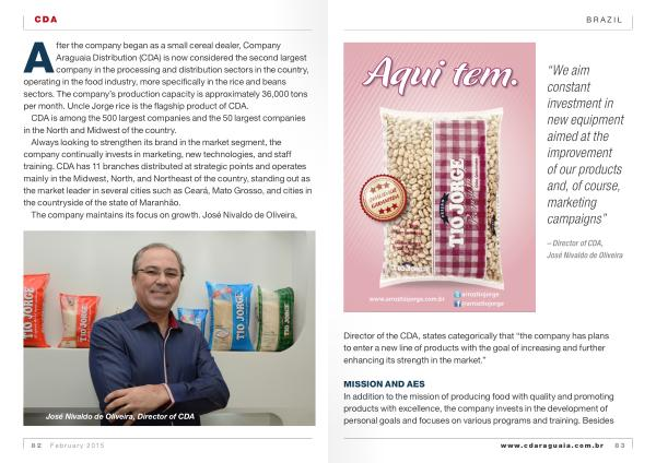 After the company began as a small cereal dealer , Company Araguaia Distribution ( CDA ) is now considered the second largest company in the processing and distribution sectors in the country , operating in the food industry , more specifically in the rice and beans sectors . The company ’ s production capacity is approximately 36,000 tons per month . Uncle Jorge rice is the flagship product of CDA .