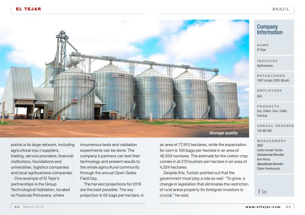 One example of El Tejar ’ s partnerships is the Group Technological Validation , located on Fazenda Primavera , where innumerous tests and validation experiments can be done . The company ’ s partners can test their technology and present results to the whole agricultural community through the annual Open Gates Field Day .