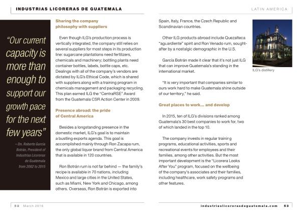 Even though ILG ’ s production process is vertically integrated , the company still relies on several suppliers for most steps in its production line : sugarcane plantations need fertilizers , chemicals and machinery ; bottling plants need container bottles , labels , bottle caps , etc . Dealings with all of the company ’ s vendors are dictated by ILG ’ s Ethical Code , which is shared with suppliers along with a training program in chemicals management and packaging recycling . This plan earned ILG the “ CentraRSE ” Award from the Guatemala CSR Action Center in 2009 .