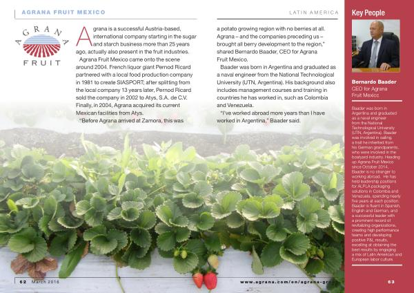 a potato growing region with no berries at all . Agrana – and the companies preceding us – brought all berry development to the region ,” shared Bernardo Baader , CEO for Agrana Fruit Mexico . Baader was born in Argentina and graduated as a naval engineer from the National Technological University ( UTN , Argentina ). His background also includes management courses and training in countries he has worked in , such as Colombia and Venezuela . “ I ’ ve worked abroad more years than I have worked in Argentina ,” Baader said .