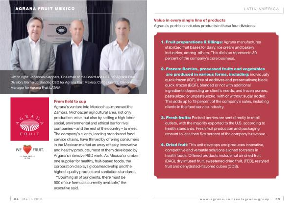 From field to cup Agrana ’ s venture into Mexico has improved the Zamora , Michoacan agricultural area , not only production-wise , but also by setting a high labor , social , environmental and ethical bar for rival companies – and the rest of the country – to meet . The company ’ s clients , leading brands and food service chains , have thrived by offering consumers in the Mexican market an array of tasty , innovative and healthy products , most of them developed by Argana ’ s intensive R & D work . As Mexico ’ s number one supplier for healthy , fruit-based foods , the corporation displays global leadership and the highest quality product and sanitation standards . “ Counting all of our clients , there must be 500 of our formulas currently available ,” the executive said .