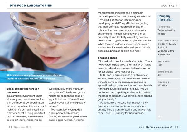 DTS Food Laboratories has a rich history of service behind it , and Richardson sees positive things to come as the business continues to spread its wings to new sectors and new clientele . “ I think the future is exciting ,” he says . “ We will continue to add capability , and we look to extend the range of clients that we service and to expand geographically .”