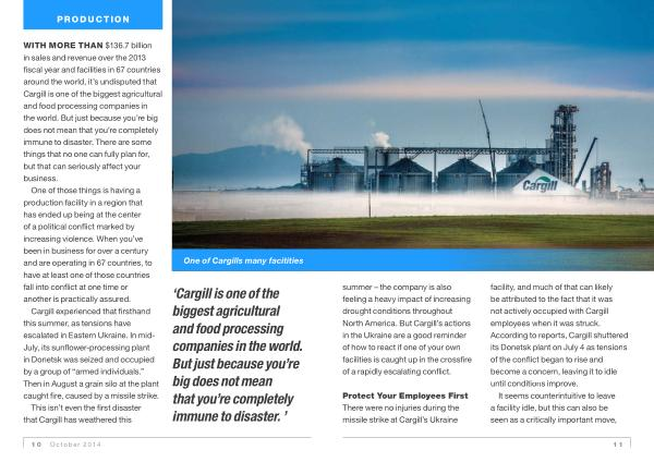 With more than $ 136.7 billion in sales and revenue over the 2013 fiscal year and facilities in 67 countries around the world , it ’ s undisputed that Cargill is one of the biggest agricultural and food processing companies in the world . But just because you ’ re big does not mean that you ’ re completely immune to disaster . There are some things that no one can fully plan for , but that can seriously affect your business .