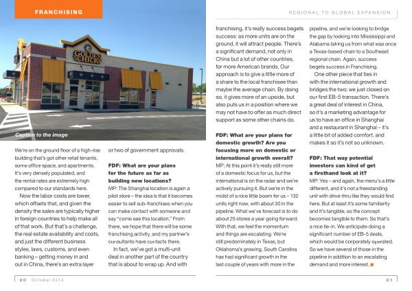FDF : That way potential investors can kind of get a firsthand look at it ? MP : Yes – and again , the menu ’ s a little different , and it ’ s not a freestanding unit with drive-thru like they would find here . But at least it ’ s some familiarity and it ’ s tangible , so the concept becomes tangible to them . So that ’ s a nice tie-in . We anticipate doing a significant number of EB-5 deals , which would be corporately operated . So we have several of those in the pipeline in addition to an escalating demand and more interest .