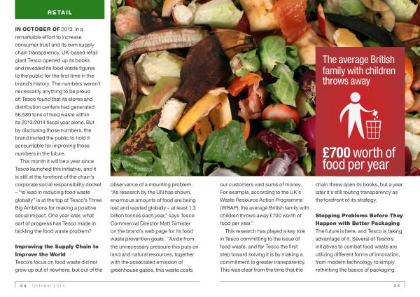 In October of 2013 , in a remarkable effort to increase consumer trust and its own supply chain transparency , UK-based retail giant Tesco opened up its books and revealed its food waste figures to the public for the first time in the brand ’ s history . The numbers weren ’ t necessarily anything to be proud of : Tesco found that its stores and distribution centers had generated 56,580 tons of food waste within its 2013 / 2014 fiscal year alone . But by disclosing those numbers , the brand invited the public to hold it accountable for improving those numbers in the future .