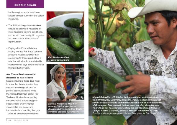 Miguel Sebastian , 22 , Mixtec indigenous man and migrant worker from Ometepec , Guerrero , harvests organic cucumbers . Miguel serves as recruiter and community liaison back in his hometown of Ometepec . Due to need , he has been working since he was 13 and has not finished elementary school . Wholesum Harvest : Campo Nuevo , Culiacán , Sinaloa , Mexico . November 29 , 2012 . Credit for all images on spread : James Rodriguez for Fair Trade USA