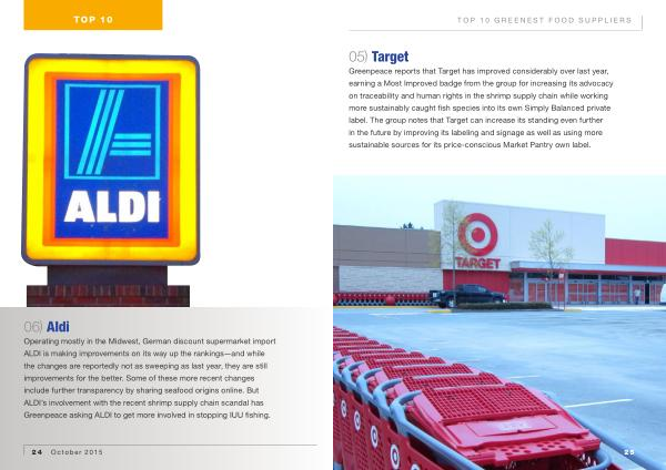 Operating mostly in the Midwest , German discount supermarket import ALDI is making improvements on its way up the rankings — and while the changes are reportedly not as sweeping as last year , they are still improvements for the better . Some of these more recent changes include further transparency by sharing seafood origins online . But ALDI ’ s involvement with the recent shrimp supply chain scandal has Greenpeace asking ALDI to get more involved in stopping IUU fishing .