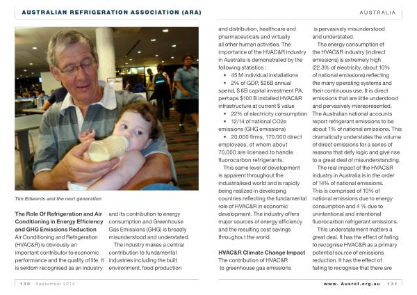 The real impact of the HVAC & R industry in Australia is in the order of 14 % of national emissions . This is comprised of 10 % of national emissions due to energy consumption and 4 % due to unintentional and intentional fluorocarbon refrigerant emissions . This understatement matters a great deal . It has the effect of failing to recognise HVAC & R as a primary potential source of emissions reduction . It has the effect of failing to recognise that there are