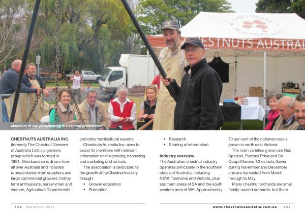 CHESTNUTS AUSTRALIA INC . ( formerly The Chestnut Growers of Australia Ltd ) is a growers group which was formed in 1991 . Membership is drawn from all over Australia and includes representation from suppliers and large commercial growers , hobby farm enthusiasts , nurserymen and women , Agriculture Departments and other horticultural experts .