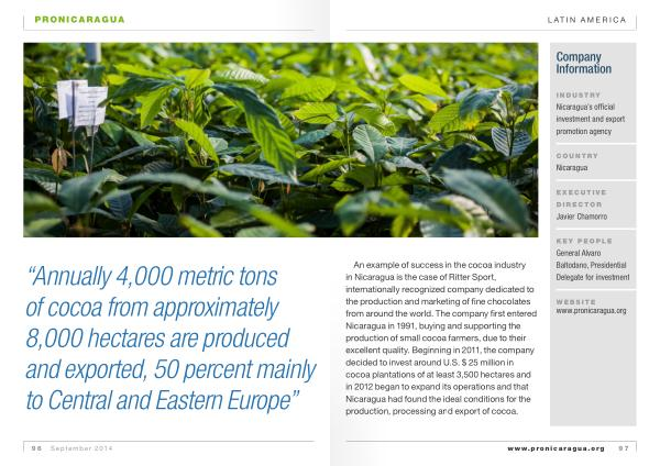 An example of success in the cocoa industry in Nicaragua is the case of Ritter Sport , internationally recognized company dedicated to the production and marketing of fine chocolates from around the world . The company first entered Nicaragua in 1991 , buying and supporting the production of small cocoa farmers , due to their excellent quality . Beginning in 2011 , the company decided to invest around U . S . $ 25 million in cocoa plantations of at least 3,500 hectares and in 2012 began to expand its operations and that Nicaragua had found the ideal conditions for the production , processing and export of cocoa .