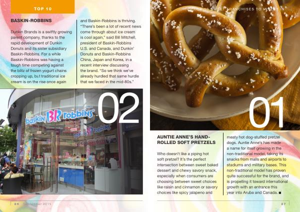 Who doesn ’ t like a piping hot soft pretzel ? It ’ s the perfect intersection between sweet baked dessert and chewy savory snack , especially when consumers are choosing between sweet choices like raisin and cinnamon or savory choices like spicy jalapeno and meaty hot dog-stuffed pretzel dogs . Auntie Anne ’ s has made a name for itself growing in the non-traditional model , taking its snacks from malls and airports to stadiums and military bases . This non-traditional model has proven quite successful for the brand , and is propelling it toward international growth with an entrance this year into Aruba and Canada .