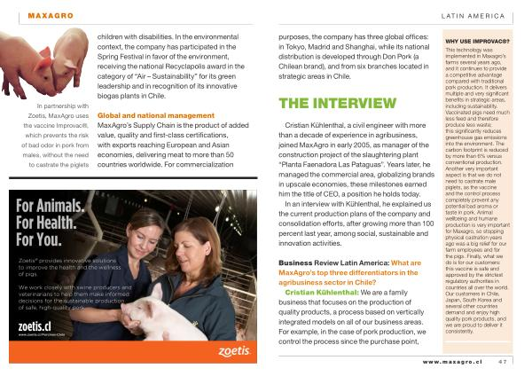 In partnership with Zoetis , MaxAgro uses the vaccine Improvac ®, which prevents the risk of bad odor in pork from males , without the need to castrate the piglets children with disabilities . In the environmental context , the company has participated in the Spring Festival in favor of the environment , receiving the national Recyclapolis award in the category of “ Air – Sustainability ” for its green leadership and in recognition of its innovative biogas plants in Chile .